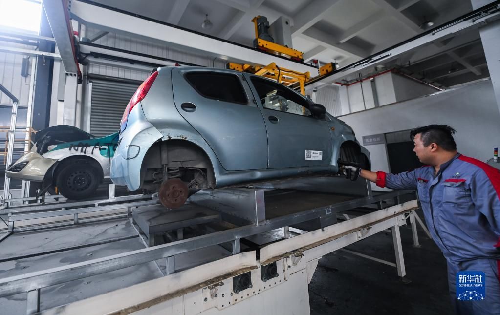 8月30日,在湖州市吴兴区东林镇一家机动车回收拆解企业的车间内,工作人员在流水线上拆解机动车的底盘。 近年来,浙江省湖州市大力发展绿色低碳循环经济,积极推动机动车回收拆解行业技术升级,提高拆解效率和效益,提升资源精细化分类再利用,推动机动车拆解行业绿色可持续发展。 新华社记者 徐昱 摄